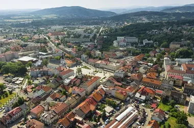 - W Lanckoronie spacer po rynku z unikatową, drewnianą zabudową.